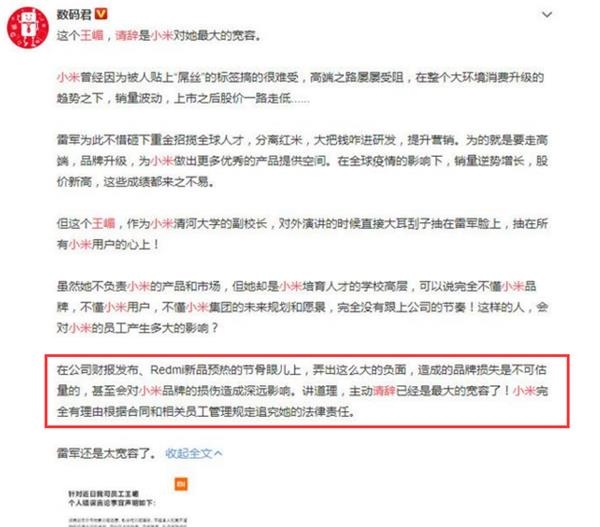 但不少米粉真爱粉们感觉自己幼小的心灵受到极大的伤害!毕竟,王媚是小米集团人力资源副总裁,是高层。