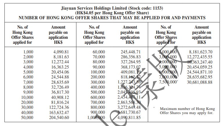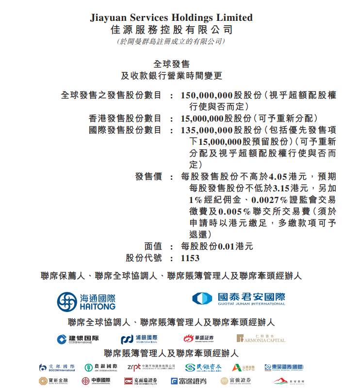 佳源服务(01153)拟发行1.5亿股,其中公开发售占比10%,国际配售占比90%,另有15%超额配股权,每股发行价为3.15-4.05港元,每手1,000股,入场费4090.81港元,2020年12月2日认购结束。预期将于2020年12月9日上市。