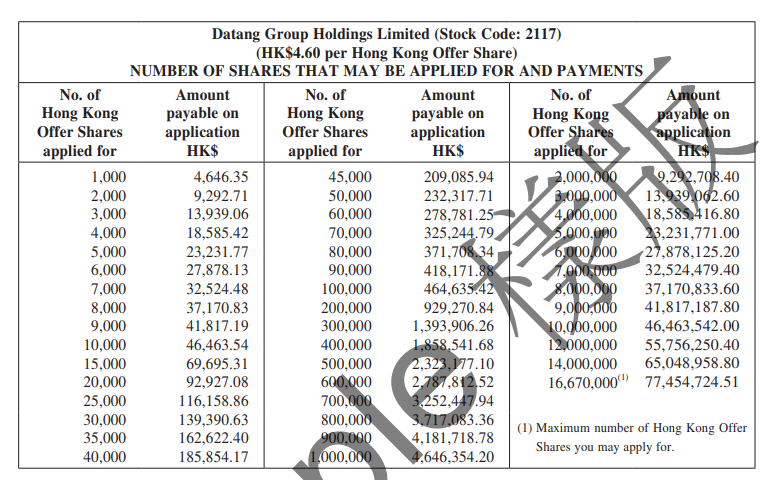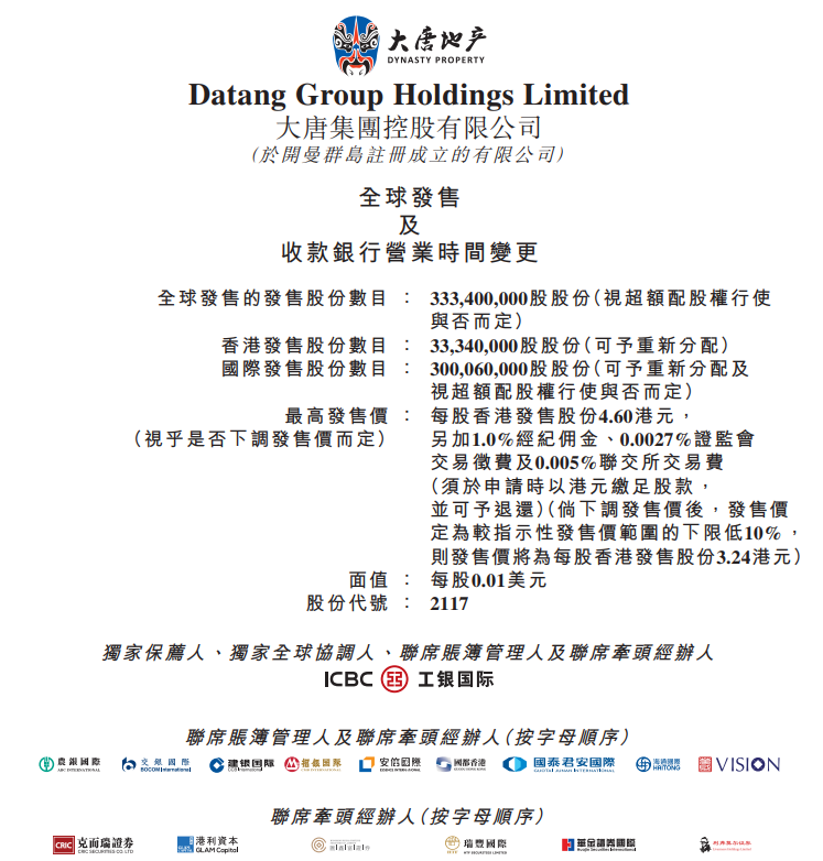 大唐集团控股(02117)拟发行3.334亿股,其中公开发售占比10%,国际配售占比90%,另有15%超额配股权,每股发行价为3.6-4.6港元,每手1000股,入场费4646.35港元,2020年12月4日认购结束,预期将于2020年12月11日上市。
