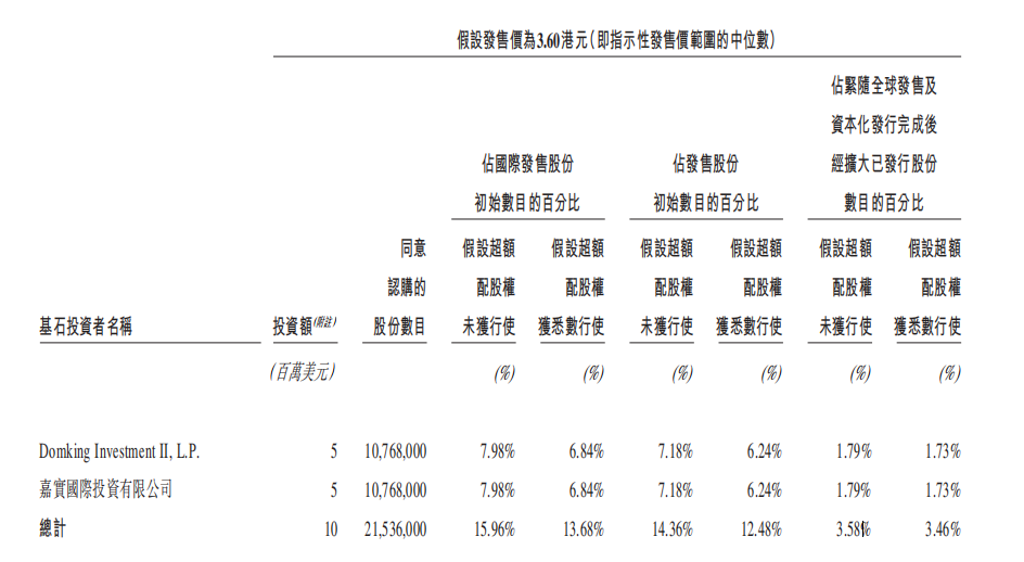 Domking Investment II, L.P.及嘉实国际投资有限公司作为基石投资者,同意合共投资1000万美元共认购2153.6万股国际发售股份,其中Domking Investment II, L.P. 是一家于2019年6月在开曼群岛成立的获豁免有限合伙企业,主要从事投资活动,目前专注物业管理行业,资产约6000万港元。Eastar Capital Management Ltd为Domking Investment的普通合伙人。Domking Investment及Eastar Capital Management Ltd由Shi Shilin最终全资拥有,其为一名在物业管理及医疗领域具有经验的专业投资者,最近参与投资京东健康股份有限公司。