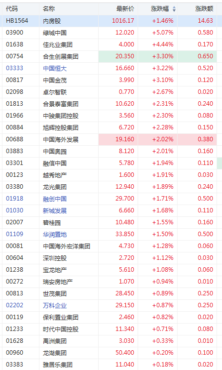 内房股普遍上涨,绿城中国涨5%,佳兆业集团涨4.44%,中国恒大、中国金茂皆升超3%,融创中国、华润置地、碧桂园等均上涨。