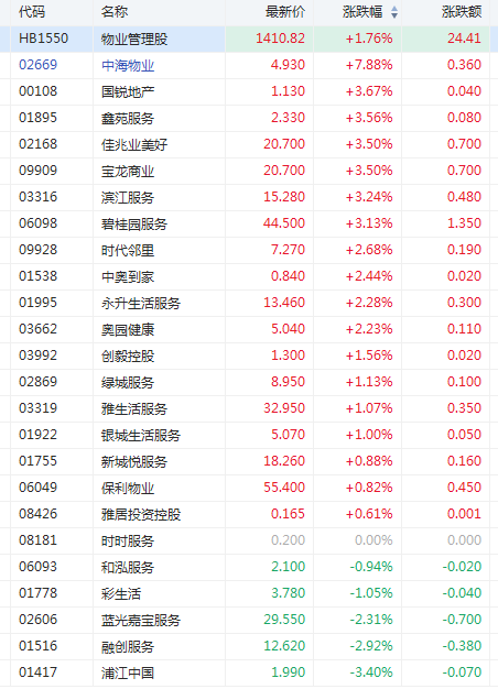 物业股反弹:中海物业大涨7% 碧桂园服务涨超3%