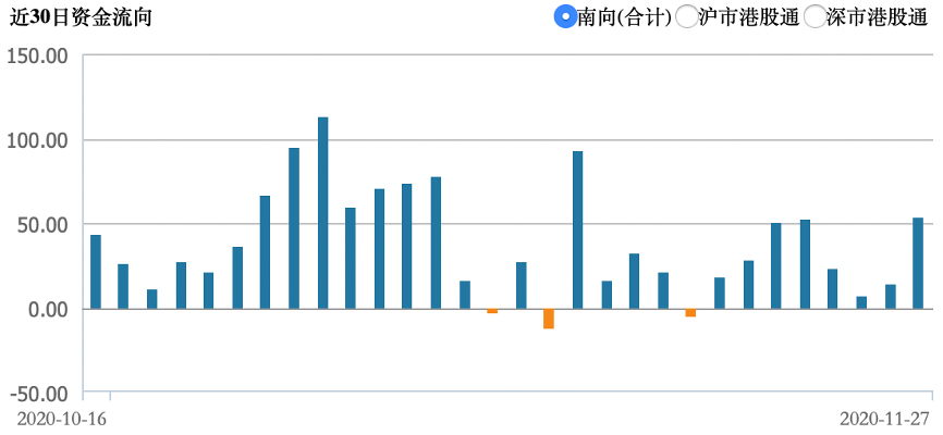 南下资金净流入港股约150亿港元,环比增加约40亿;