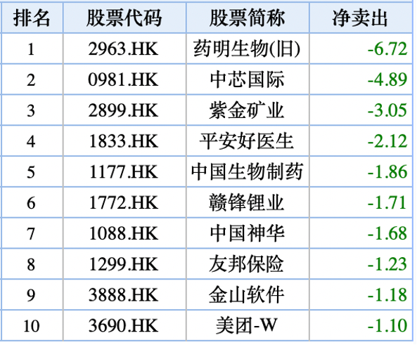 此外,南下资金抛售中芯国际约5亿港元,卖出紫金矿业约3亿港元。平安好医生、中国生物制药、赣锋锂业、中国神华等个股也遭到内资抛售。