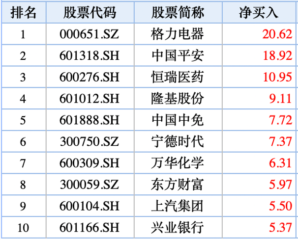 本周北上资金买入金额最多的标的为格力电器,一周净买入20.62亿元。