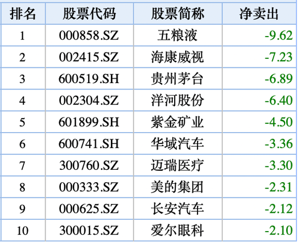 此外,北上资金净卖出海康威视、贵州茅台约7亿元,卖出洋河股份约6亿元。