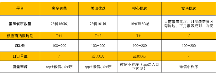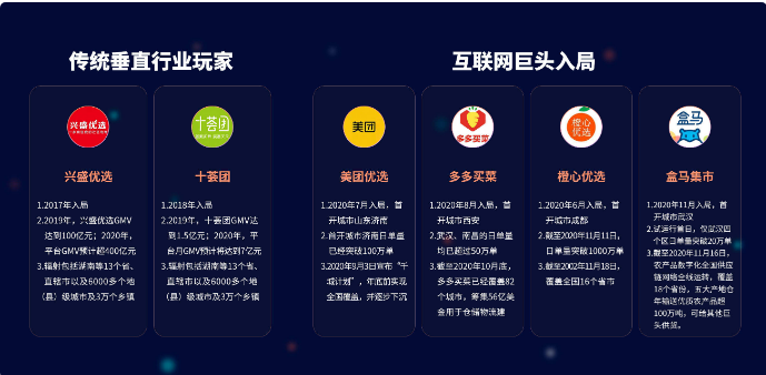 随后,美团优选7月旋即上线,由S-team成员——美团高级副总裁、原酒旅负责人陈亮负责;8月,拼多多入局;10月底,姗姗来迟的盒马也加入战局。巨头们的迅速涌入,让竞争局势在转瞬之间变得紧张。