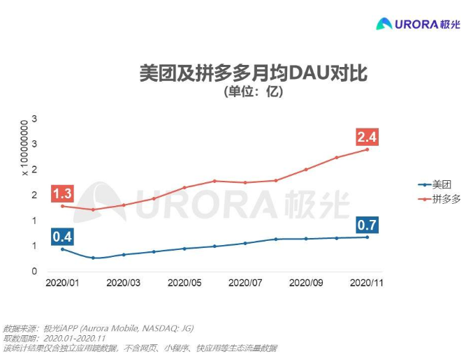 9月时,有投资人告诉36氪,“美团没有一个城市打透,拼多多在武汉和南昌还是很厉害。”而根据极光向36氪提供的数据,从今年8月到11月间,基于对App的数据监测,拼多多的“月均日活”数据涨势更陡峭。