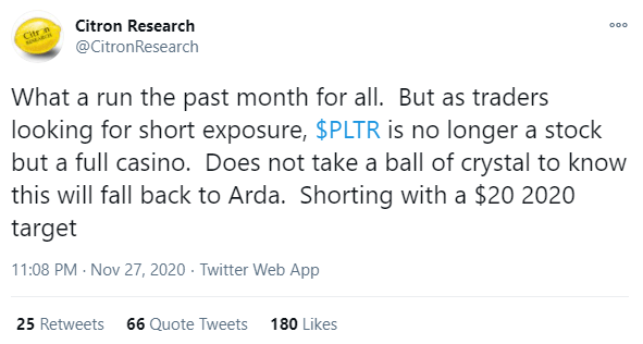 香橼发布推特沽空Palantir,称交易者正在寻找空头头寸,Palantir已经不再是一只股票,而是一个赌场。香橼认为Palantir在2020年会跌至20美元。
