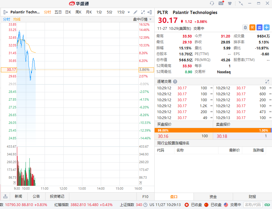 Palantir目前涨3.86%报30.17美元,此前股价涨幅一度收窄至1%。