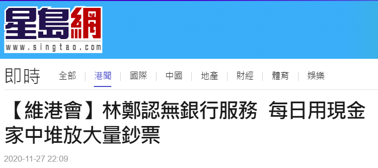 香港“星岛网”、《头条日报》报道,林郑月娥接受香港有线电视英文专访时,被问到美国因香港国安法对她实施制裁后生活有没有不便,她透露她作为香港的首长,没有银行能提供服务,她每日用现金买所有的东西。