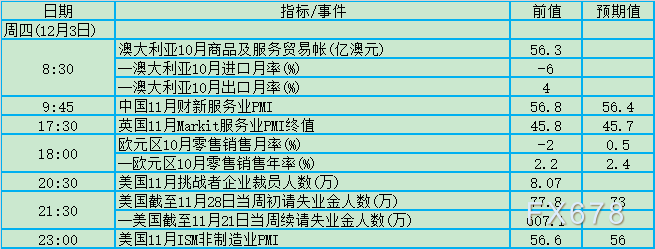 周四(12月3日)关键词:澳大利亚贸易帐、美国初请失业金、美国ISM非制造业PMI