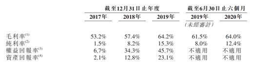 反应到实际经营状况中,蓝月亮展现出强劲的盈利能力。招股书显示,2017-2019年,蓝月亮分别实现营业收入56.32亿、67.68亿和70.50亿港元,复合年增长率为11.9%,据悉同期行业零售额的复合年增长率仅为4.9%。与此同时,蓝月亮同期销售及分销开支大幅减少,占总收益的比重从2017年的36.7%降至2019年33.0%,毛利率由2017年的53.2%大幅提升至2019年的64.2%;净利率由2017年的1.5%大幅提升至2019年的15.3%。