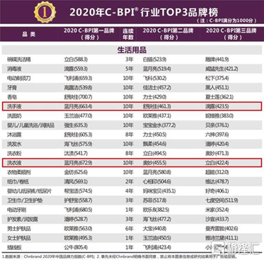 2011年-2020年,以综合品牌实力计算,蓝月亮品牌在中国洗衣液市场及洗手液市场连续10年稳居C-BPI行业品牌榜首。C-BPI一度誉为中国品牌界的年度风向标,其研究成果和对品牌价值解读都具备极高的权威性,是中国消费者和企业最信赖的品牌价值评价体系之一。