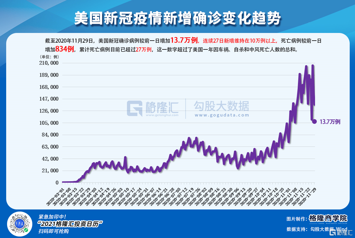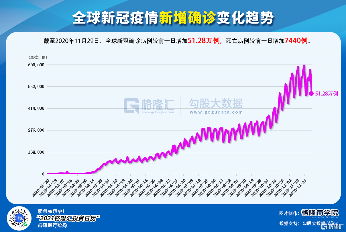 截至2020年11月30日08:55,中国以外累计确诊新冠肺炎超6287万例 ,累计死亡超145万例 ,全球新冠确诊病例较前一日增加51.28万例 ,死亡病例较前一日增加7440例,全球累计死亡过万例国家或地区已达25个。