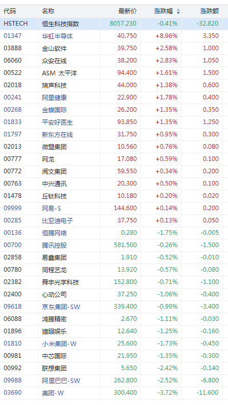 恒生科技指数微跌 华虹半导体涨超8%美团跌超3%