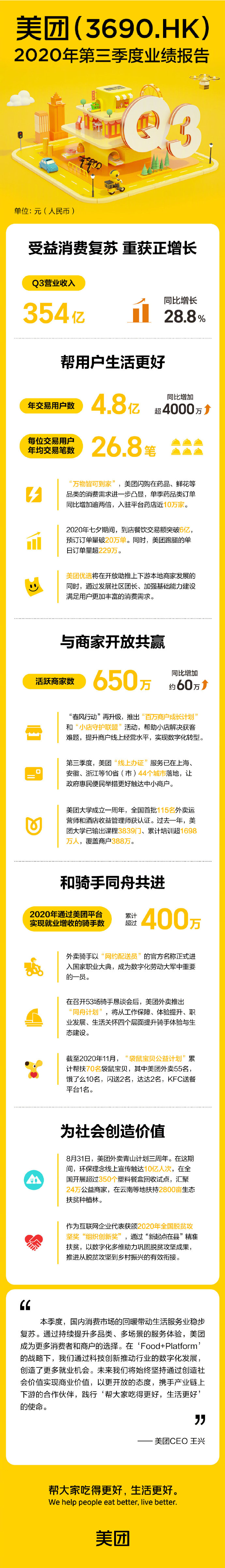 美团CFO陈少晖表示:“中国蓬勃发展的消费市场是我们发展的最大动力,让我们对科技所能带给行业和社会的价值充满期待。美团会继续围绕用户、商家、骑手及上下游合作伙伴来持续加强核心能力的建设。我们的投入将坚持以长期回报为导向,不断提升客户体验和行业效率,推动建设健康有序的行业生态,让行业参与者最终都从科技变革中受益。”