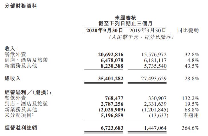财报显示,2020年第三季度,美团到店,酒店及旅游业务收入增加4.8%至人民币65亿元。到店,酒店及旅游业务的经营溢利由2019年第三季度的人民币23亿元增加至2020年第三季度的人民币28亿元,而营业利润率则由37.7%升至43.0%。