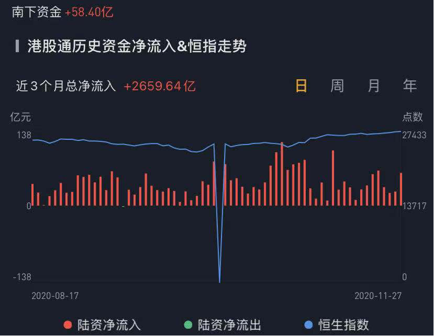 南下资金今日净流入港股58.40亿港元,流入规模较上周平均有所增长。