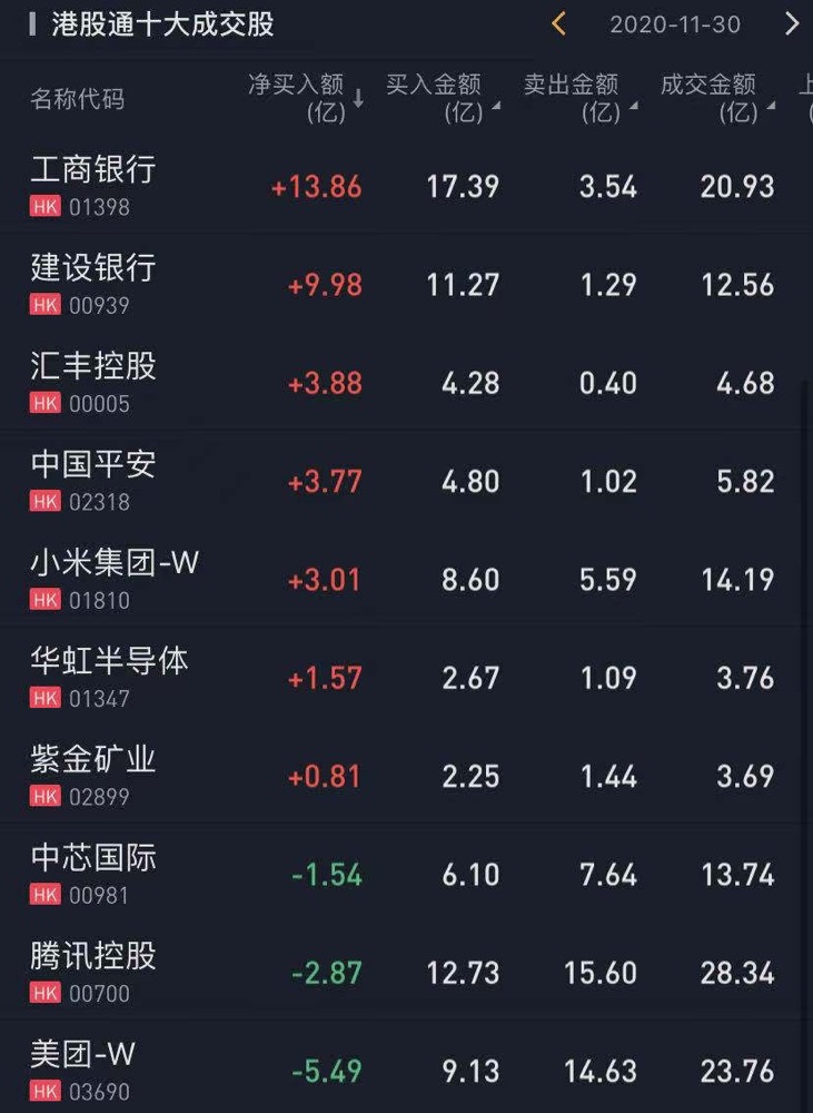 个股方面,今日南下资金净买入工商银行13.86亿港元,为今日买入之最。此外,南下资金净买入建设银行9.98亿港元,净买入汇丰控股3.88亿港元。此外,南下资金净卖出美团-W5.49亿港元。