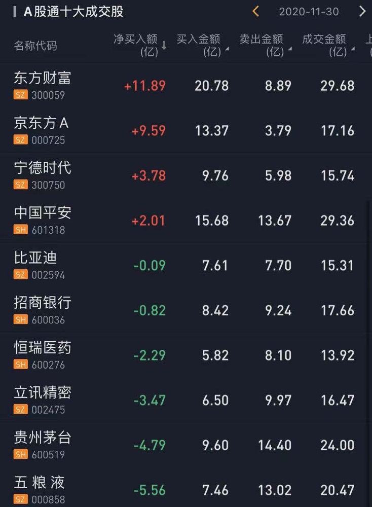 北上资金今日净买入东方财富11.89亿元,为今日买入之最。此外,南下资金净买入京东方A9.59亿元,净买入宁德时代3.78亿元。此外,北上资金净卖出五粮液5.56亿元,为今日抛售之最。