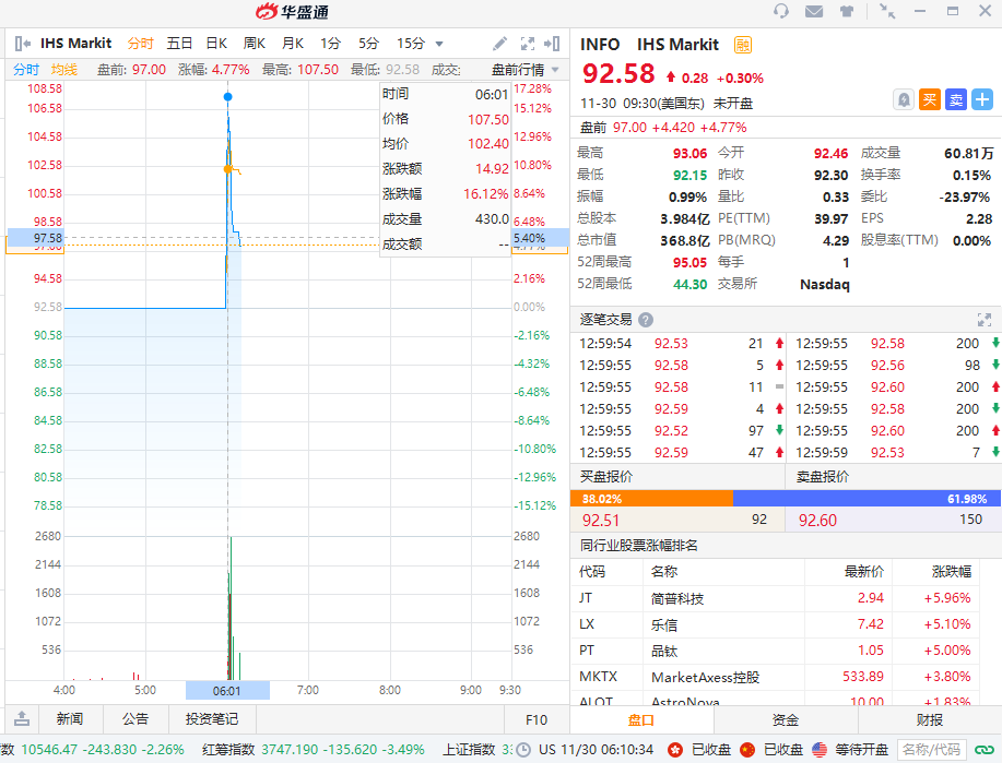 11月30日(周一)美股盘前,IHS Markit Ltd.(INFO.US)股价大涨,一度涨超16%。