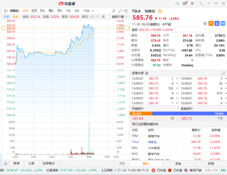 特斯拉盘前一度涨超3%,开盘后股价势将站上600美元。