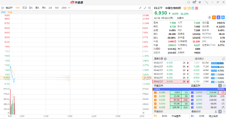12月1日消息,中国生物制药前三季净利下降18%,股价大跌11.15%,报6.93港元。