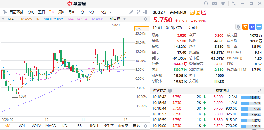 百富环球(00327)早盘一路飙升,盘中最高见5.82港元,创下四年以来新高,现报5.75港元,涨幅19.29%,最新总市值62.37亿港元;该股年内已累计涨逾60%。