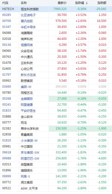 比亚迪电子涨超3%,腾讯、华虹半导体、鸿腾精密、瑞声科技涨超2%。