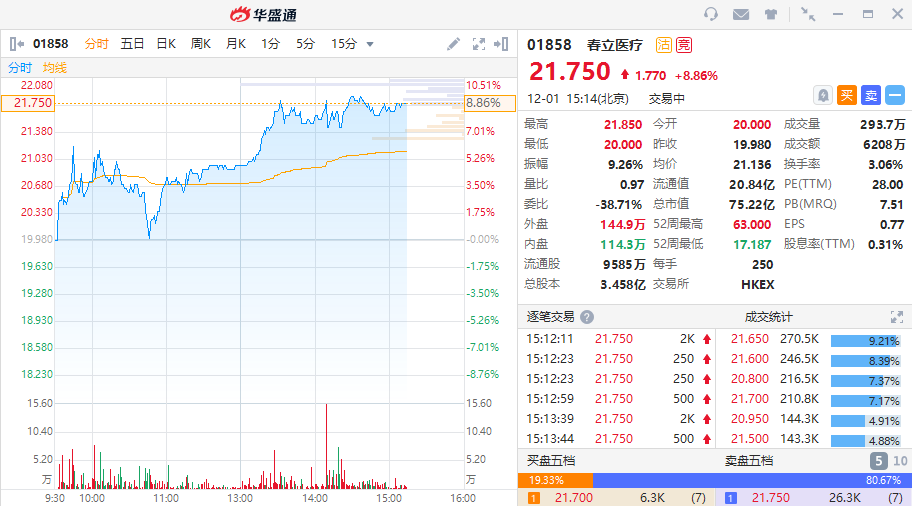 12月1日下午消息,春立医疗(01858)盘中涨幅扩大至8%,截至发稿,春立医疗涨8.86%,报21.7港元,港股市值75.22亿港元,三日累计涨超20%。