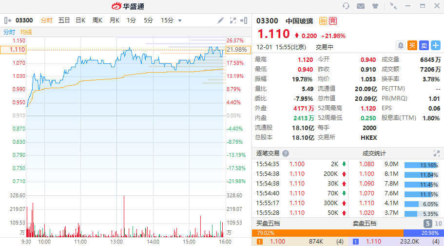中国玻璃延续涨势,盘中最高见1.12港元刷新52周新高,现报1.11港元,涨幅21.98%,成交额达7206万港元;月内累计涨幅逾40%。