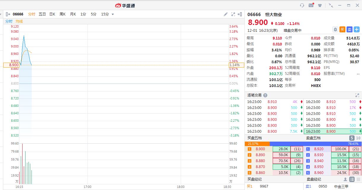 恒大物业今日16:15-18:30期间进行暗盘交易,目前涨1.14%,一度涨超3%。不计手续费,一手盈利50港元。该股明日正式上市。