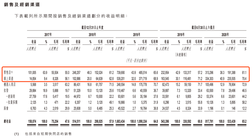 在销售渠道方面,泡泡玛特的销售结构以零售店、线上渠道为主,机器人商店、批发、展会渠道为辅。2017-2019财年,零售店及线上渠道合计销售占营收比例分别为73.3%、68.3%、75.9%,2020H1占比为79.2%。