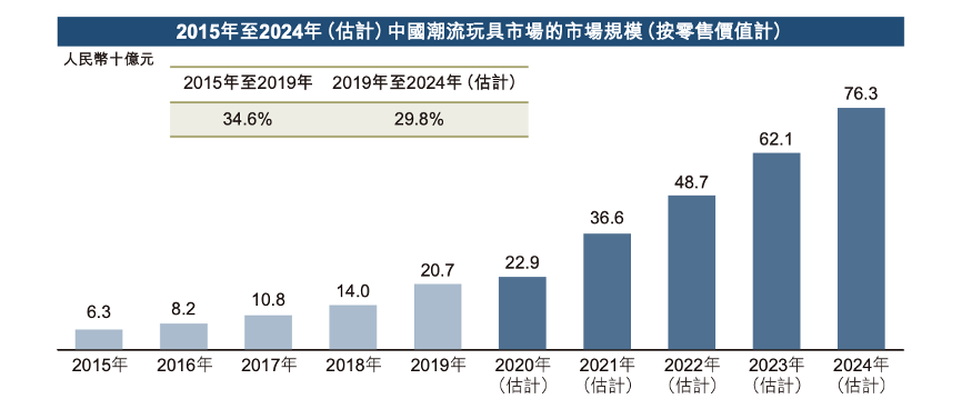 历史上看,中国潮流玩具零售的市场规模由2015年的63亿元快速增加至2019年的207亿元,复合年增长率便已高达34.6%。