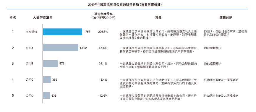 2019年,按零售价值计,前五大市场参与者在中国潮流玩具零售市场所占的市场份额分别为8.5%、7.7%、3.3%、1.7%及1.6%。按零售价值计,泡泡玛特是中国最大的潮流玩具品牌,市场份额为8.5%,并录得迅速增长!