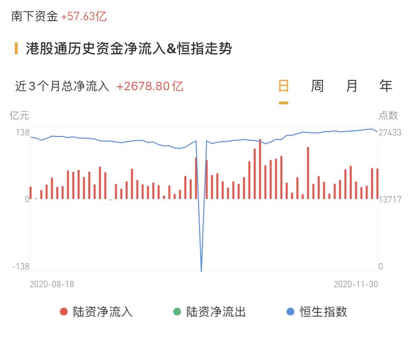 南下资金今日净流入港股57.63亿港元,流入规模较昨日的58.40亿港元有所减少。