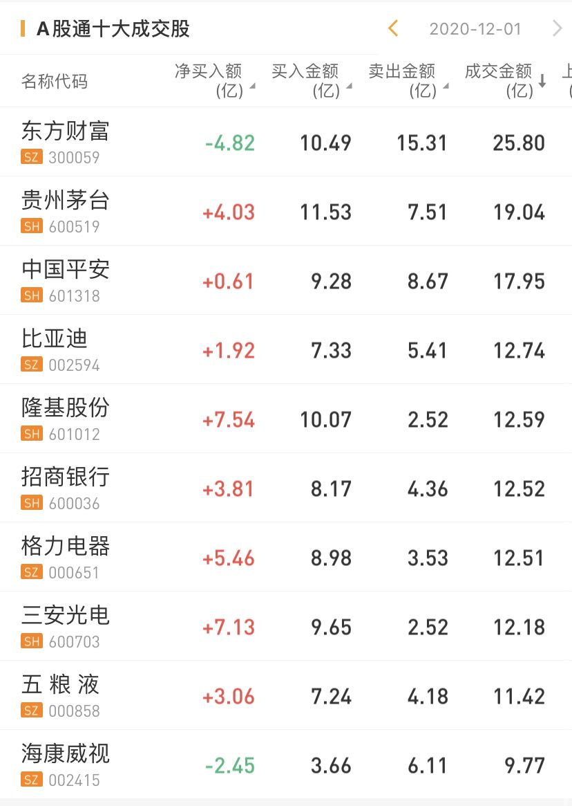 北上资金今日净买入隆基股份7.54亿元,为今日买入之最。净买入格力电器5.46亿元,净买入贵州茅台4.03亿元。此外,北上资金净卖出东方财富4.82亿元,为今日抛售之最。