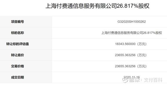 近日,‘支付百科’独家获悉,上海联合产权交易所挂出的最新公告中显示,上海付费通信息服务有限公司26.817%的股权已经交易完成,最终交易价格为23655.363256万元(约2.36亿)。