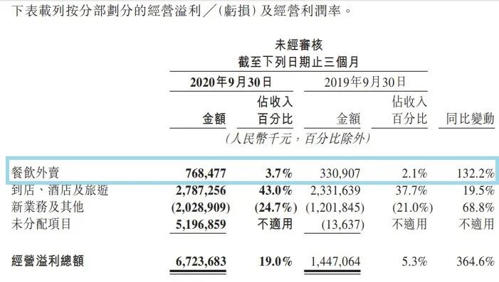 和去年同期比,到店、酒店及旅游业务的经营溢利,由去年同期的23亿元增至28亿元,经营利润率则由37.7%升至43.0%。