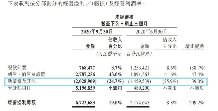 新业务及其他业务依旧是经营亏损。由2020年二季度的亏约15亿元,扩大39.0%至2020年三季度的亏约20亿元。美团解释: