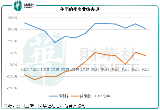 扣除投资公允值收益、无形资产减值、重组等等非经常性项目,美团第三季的经调整EBITDA(扣税、息、折旧及摊销前盈利)同比增长17.1%,至26.75亿元,净调整EBITDA利润率较上年同期下降了0.7个百分点,较上个季度下降3个百分点,至7.6%。