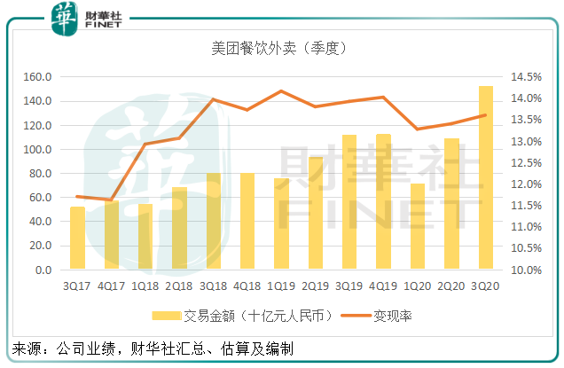 从上图可见,第三季餐饮外卖业务收入明显高于2019年第3季和2020年第2季。从下图的餐饮外卖交易金额可见,第三季明显增长,而且处于纪录高位,但变现率有所下降。