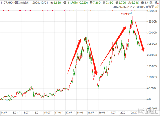 中国生物制药是中国四大传统药企巨头之一,港股股价波动率实在是太大,令投资者抓狂。2017年初至2018年5月,股价走出一波大行情,累计上涨260%。令人绝望的是,接下来半年多时间,股价暴跌超过60%,基本快把过去的涨幅全部磨平。等投资者绝望的时候,股价又来了一波主升浪,一直到今年7月,累计涨幅超过200%。之后4个多月,中生制药再度暴跌36%。