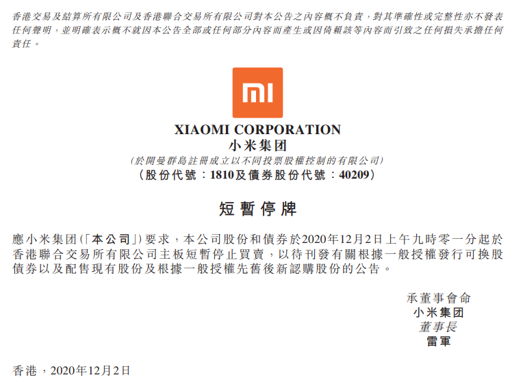 12月2日上午,在港交所公告,小米集团的股份(01810)和债券(40209)已于上午九时零一分起短暂停止买卖。因此,与该公司有关的所有结构性产品亦已同时短暂停止买卖。