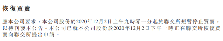 12月2日午间消息,小米集团发布公告称,将于周三下午1点恢复交易。