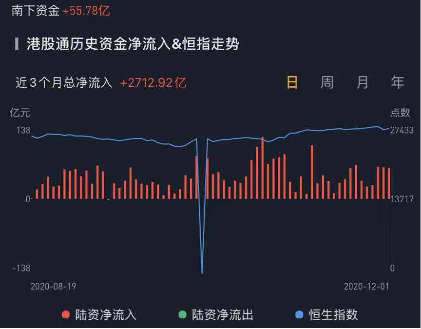 南下资金今日净流入港股55.78亿港元,流入规模持续维持高位。