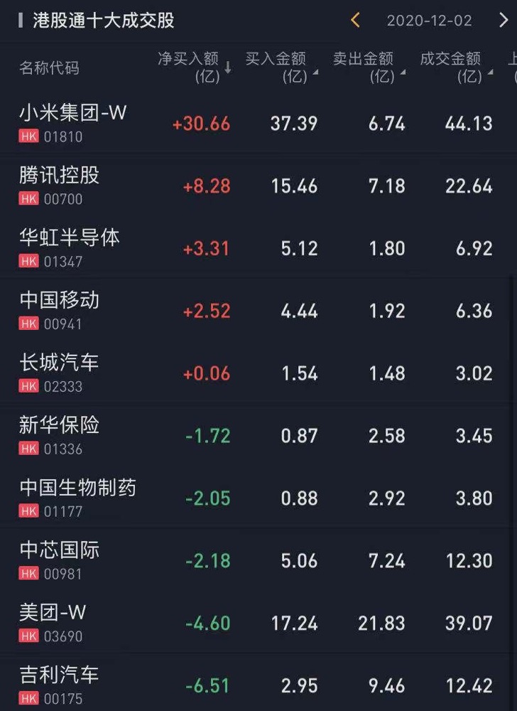 个股方面,今日南下资金净买入小米集团-W30.66亿港元,为今日买入之最。此外,南下资金净买入腾讯控股8.28亿港元,净买入华虹半导体3.31亿港元。此外,南下资金净卖出吉利汽车6.51亿港元。