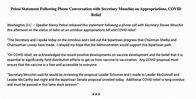 佩洛西昨晚则在与财长努钦通话后发表了以下声明: