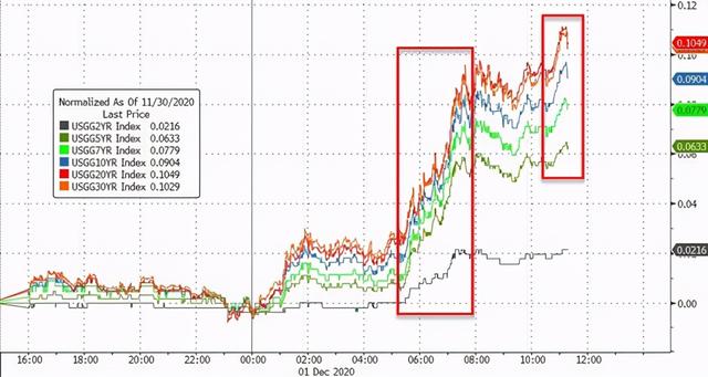 消息推动美股三大指数集体冲高,标普、纳指刷新收盘历史新高,美债收益率大幅攀升,20年期和30年期美债收益率一度攀升逾10个基点。但尾盘美股三大指数曾一度出现回落,美债收益率也再度走低。